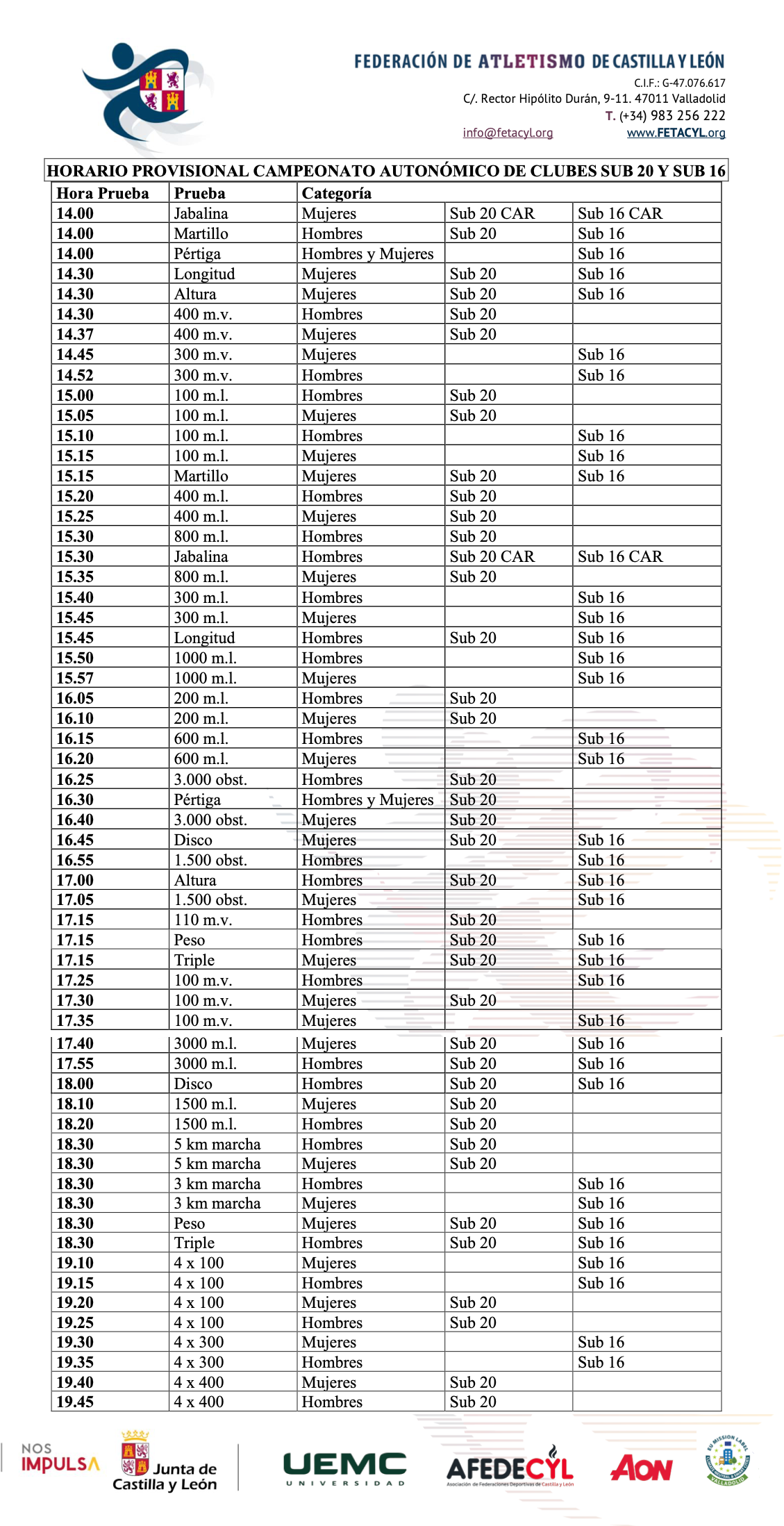 | 19 | PRO | CAMPEONATO PROVINCIAL DE ATLETISMO ESCOLAR INF-CAD | PISTA UNIVERSIDAD DE LEÓN | AIRE LIBRE | DIPUTACIÓN PROVINCIAL – DELEGACIÓN LEONESA | REGLAMENTO HORARIO |